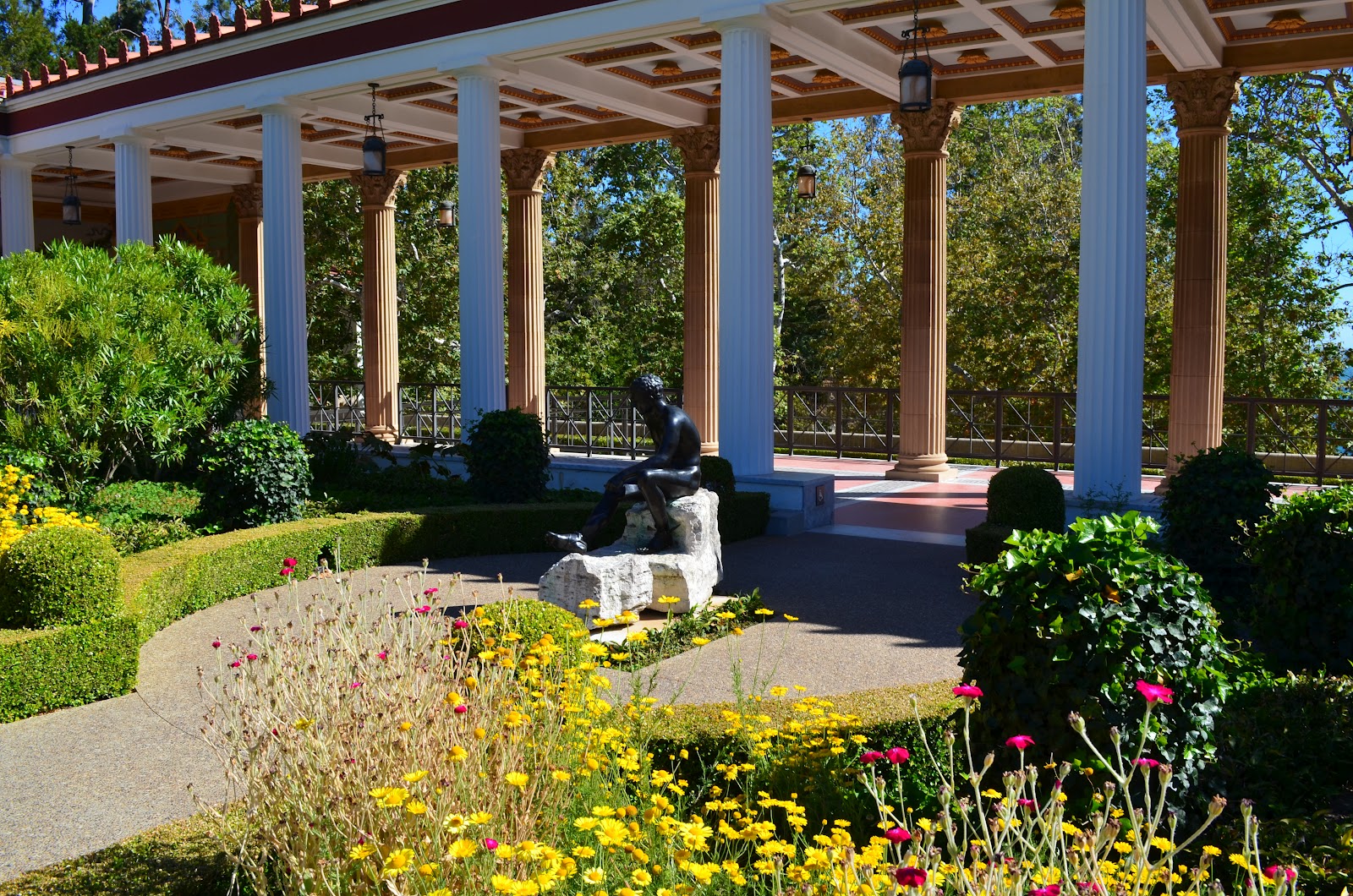 The Getty Villa's Formal garden was inspired by the temples and bath of the Villa Papyri in Herculaneum. The pictures above and below shows each end of the Getty Villa Roman inspired formal garden. The pool or Roman bath is surrounded by a Roman Temple like veranda. According to historians of the Getty Villa, J. Paul Getty requested to design and build a Roman garden based on the notion of "What did the Ancient Romans felt like walking around the garden?" Well, for a Present time visitor like me, walking around these gardens definitely felt like being in a Roman Villa. The whole temple surrounding the bath was built with stencilled marble tiles in terracotta colour, the walls were painted with floral garlands, lightened by lanterns and the ceiling has golden medallions. Then in the bath and surrounding garden is filled with black statues like they were stained from the lava of the eruption of Mount Vesuvius in Naples during Ancient Roman times. This garden is a very authentic and well designed Ancient Roman garden. According to historians of the Villa, " J.Paul Getty built his Villa and gardens in the spirit of Ancient Roman civilization and brought the art of the Ancient Mediterranean to life." Julies Caesar, Cleopatra and Mark Anthony will definitely feel at home in the Getty's Villa and Gardens. You will enjoy to discover it too, just like we did when stopped by. Such romantic Statues in each end of the pool. The formal garden's design was very symmetrical filled with Black Statues, orange trees and even the columns were measured and spaced out precisely. The formal garden is filled with some wildflowers, some green plants and some of these Black Statues scattered around the garden. The whole combination of the temple columns, the golden medallion ceilings, the lanterns, the Statue and the wildflowers are just perfect and beautiful! Notice that the white columns in front are a classic Doric Columns while the columns behind are Corinthian columns. Oh la la la! Closer view of the Temple with the classic Doric columns, painted walls and the golden medallions in the ceilings. A closer view with natural light inside makes the whole hallway golden! I love the terracotta coloured and stencilled marbles on the flooring. Just a perfect and classic design! See how long the hallways? Same applies to the opposite side. Everything was measured in symmetry just like during the Ancient Roman times. A circular sitting area with graphic tiled floor to admire the garden view and for the tired visitor. "The beauty one can find in art is one of the pitifully few real and lasting products of human endeavour." J. Paul Getty. If you wish to learn more about the history of The Getty Villa, click my previous blog post, The Getty Villa Museum to see more Villa pictures and to watch the Video. I wish you all a lovely weekend! Bonne Fete Nationale: Happy Bastille Day to all my readers in France! |