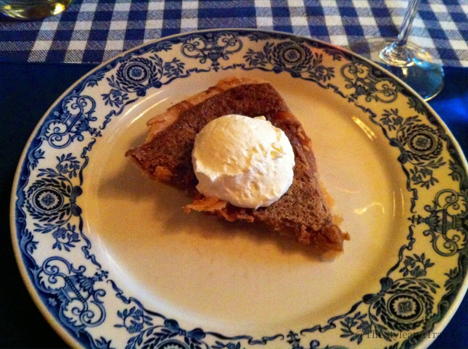 For dessert, a traditional Canadian maple syrup pie with unsweetened whipped cream. This is one of my favourite desserts. Here in Toronto, they make this as Butter tarts. One can only try this here in Canada.